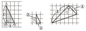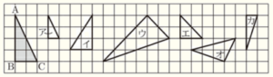 (1) 下の方眼において,\( △ABC \) と相似である三角形をア~カから2つ選び,その記号を書け。