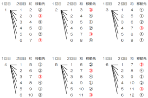 さいころを2回投げたときの出た目の組み合わせとそれぞれの場合の行き先を樹形図として書き出すと