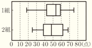 イ 箱ひげ図から,1組の最小値は \( 20 \) 点未満,最大値が \( 70 \) 点より大きいので,