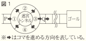 (2) 図1は,3人がしている「すごろく」の一部であり,AさんのコマとBさんのコマがともに \( P \) のマスにある。\( P \) のマスと \( Q \) のマスの間には,➀,➁,➂,➃の4つのマスからなる「迷宮トンネル」があり,この「迷宮トンネル」には次の規則がある。