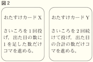 また,図2のように「おたすけカードX」と「おたすけカードY」があり,カードを持っていればさいころを投げる直前に使うことができる。Aさんは「おたすけカードX」を,Bさんは「おたすけカードY」を持っており,AさんもBさんもそれぞれ持っているカードを使うことにした。