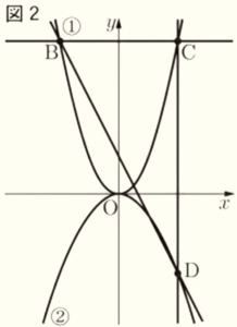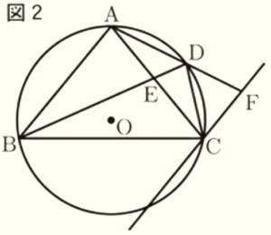 (2) 図2において,\( \stackrel{\huge\frown}{ AD }=\stackrel{\huge\frown}{ DC } \) であり,点 \( C \) を通り,線分 \( AB \) と平行な直線と直線 \( AD \) の交点を \( F \) とする。