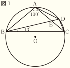 (1) 図1のように,\( ∠BAC=100° \),\( ∠EBC=13° \) のとき,\( ∠AEB \) の大きさを求めなさい。