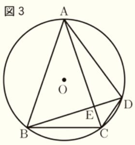 図1~3のように,円 \( O \) の周上に4点 \( A,B,C,D \) があり,\( AB=AC \) とする。また,線分 \( AC \) と \( BD \) の交点を \( E \) とする。