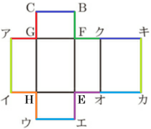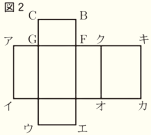(1) 図2の展開図を組み立てたとき,点 \( C \) と重なる点をア~クからすべて選び,その符号を書きなさい。