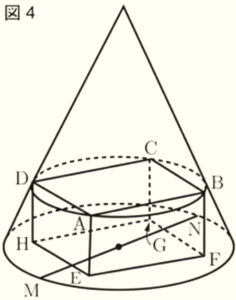 (3) 図4のように,高さ \( 8 \; cm \) の円錐があり,その中に直方体 \( ABCD -EFGH \) が入っている。直方体の頂点のうち,4点 \( A,B,C,D \) は,いずれも円錐の側面上にあり,4点 \( E,F,G,H \) は,いずれも円錐の底面上にある。また,円錐の底面である円の周上に2点 \( M,N \) があり,線分 \( MN \) は円の直径である。