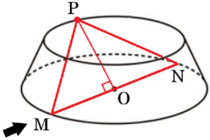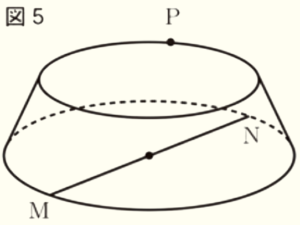 図5は,図4の円錐を4点 \( A,B,C,D \) を通る平面で切断してできた2つの立体のうち,線分 \( MN \) を含むほうであり,切り口の円の周上を動く点を \( P \) とする。