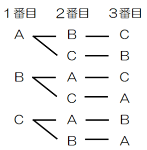 3人が投げる順番を樹形図に書き出すと,次の6通りになります。