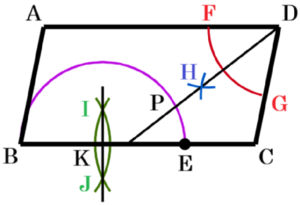 線分 \( BE \) を直径とする円の中心は線分 \( BE \) の中点なので,線分 \( BE \) の垂直二等分線を作図することで求めることができます。