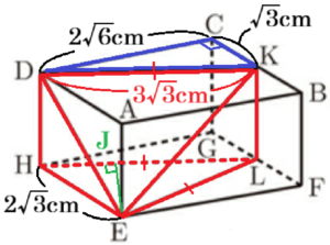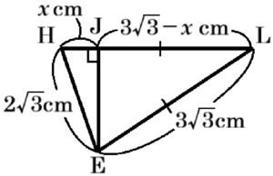 \( △EHL \) において,点 \( E \) から線分 \( HL \) に垂線をひいた交点を \( J \) とし,\( HJ=x \; cm \) とすると,\( EL=HL=DK=3\sqrt{3} \; cm \) なので,