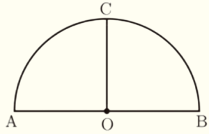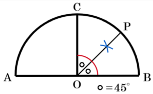 7 右の図のような,線分 \( AB \) を直径とする半円があり,線分 \( AB \) の中点を \( O \) とします。点 \( O \) を通って線分 \( AB \) に垂直な直線と \( AB \) との交点を \( C \) とします。\( \stackrel{\huge\frown}{ BC } \) 上にあって,\( ∠POB=45° \) となる点 \( P \) を作図によって求めるとき,その作図の方法を説明したものとして,誤っているものを,あとのア~エから1つ選び,記号で答えなさい。
