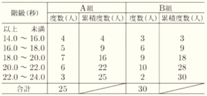 8 ある学年で,クロールで \( 25 \; m \) を泳いだときの記録をとりました。下の表は,このときの,A組の生徒 \( 25 \) 人とB組の生徒 \( 30 \) 人の記録を,累積度数をふくめて度数分布表に整理したものです。