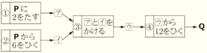 1 下の図は,P に整数を入れると,➀~➃の順に計算が行われ,Q の値が導き出される過程を表しています。 \( \boxed{ア} \) には➀,\( \boxed{イ} \) には➁,\( \boxed{ウ} \) には➂の計算を行った結果の値がそれぞれ入ります。