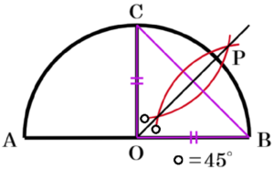\( △OBC \) は直角二等辺三角形なので,線分 \( BC \) の垂直二等分線は \( ∠COB \) の二等分線になります。