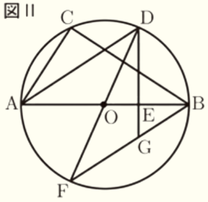 4 図Ⅱは,図Ⅰにおいて,直線 \( DO \) と円 \( O \) との交点のうち,\( D \) 以外の点を \( F \) とし,点 \( B \) と点 \( F \) を結んだものです。また,線分 \( DE \) を \( E \) の方に延長した直線と線分 \( BF \) との交点を \( G \) とします。\( △DFG \) の面積を求めなさい。
