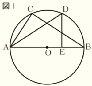 長さが \( 6 \; cm \) の線分 \( AB \) を直径とする円 \( O \) があります。図Ⅰのように,円 \( O \) の周上に,点 \( C \) を \( BC=5 \; cm \) となるようにとり,点 \( A \) と点 \( C \),点 \( B \) と点 \( C \) をそれぞれ結びます。また,点 \( A \) をふくまない方の \( \stackrel{\huge\frown}{ BC } \) 上に,点 \( D \) を \( \stackrel{\huge\frown}{ AC }=\stackrel{\huge\frown}{ BD } \) となるようにとり,点 \( A \) と点 \( D \) を結びます。さらに,点 \( D \) から線分 \( AB \) に垂線をひき,線分 \( AB \) との交点をEとします。