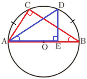 \( ∠ADB \) は直径 \( AB \) に対する円周角なので,\( ∠BDA=90° \) であり,\( ∠ACB=∠BDA \)