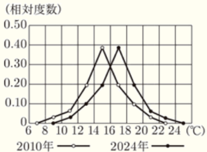 (7) 右の図は,ある地域の2010年3月と2024年3月の日平均気温をもとに,横軸を気温,縦軸を相対度数として度数分布多角形に表したものである。