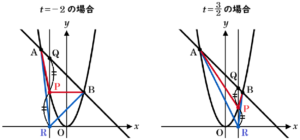 2より,\( t=0 \) のとき,\( △APQ=9,△BPQ=6 \) なので,二等分されていません。