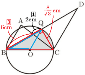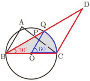 補助線 \( OQ \) をひいて,\( △OBQ \) とおうぎ形 \( OCQ \) にわけて面積を求めます。
