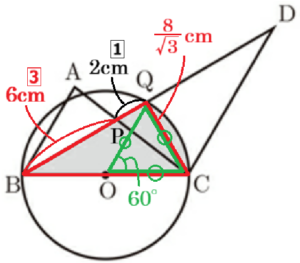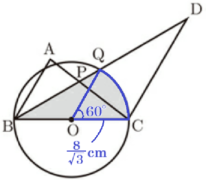 おうぎ形 \( OCQ \) は,半径 \( \dfrac{8}{\sqrt{3}} \; cm \),中心角 \( 60° \)