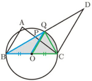 補助線 \( CQ \) をひくと,\( ∠BQC \) は直径 \( BC \) に