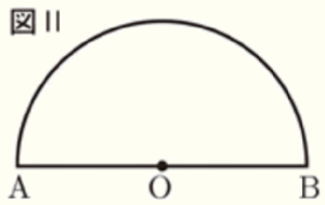 図Ⅱにおいて,点 \( O \) は半円の中心,線分 \( AB \) は半円の直径を表している。点 \( O \) を通り,線分 \( OA \) の方から順番に切れ目を入れていくとき,1つ目の切れ目にあたる直線 \( OP \) を,コンパスと定規を使って作図しなさい。作図に用いたは線は消さずに残しておくこと。