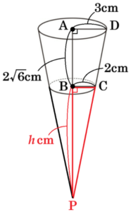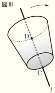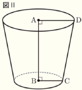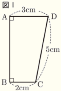 図Ⅰのような \( AD=3 \; cm,BC=2 \; cm,DC=5 \; cm \),\( AD//BC \) の台形 \( ABCD \) がある。また,図Ⅱは,図Ⅰを直線 \( AB \) を回転の軸として1回転させてできる立体である。