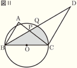 3 図Ⅱは,図Ⅰに線分 \( BC \) を直径とする円 \( O \) をかき,円 \( O \) と線分 \( BD \) との交点を \( Q \) としたものである。