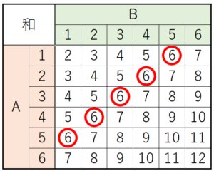 和が \( 6 \) になる組み合わせは \( 5 \) 通り,