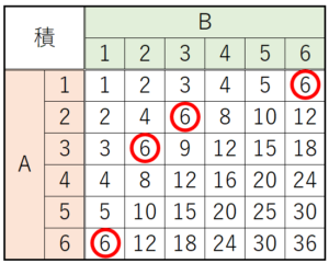 積が \( 6 \) になる組み合わせは \( 4 \) 通り,