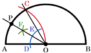 手順5の直線と \( \stackrel{\huge\frown}{ AB } \) との交点が求める点 \( P \) になります。