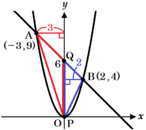 \( △OBQ \) の面積をより簡単に求めるために,まず,\( △OBQ \) と \( △BQC \) の面積比を求めます。