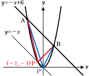 よって,等積変形の考え方から,\( △APB \) と \( △AP’B \) の面積は等しくなっています。