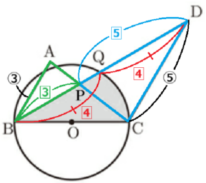 補助線 \( CQ \) をひくと,\( ∠BQC \) は直径 \( BC \) に