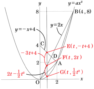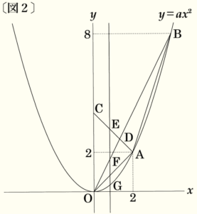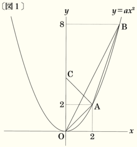 下の〔図1〕のように,関数 \( y=ax^2 \) のグラフ上に2点 \( A,B \) があり,点 \( A \) の座標は \( (2,2) \),点 \( B \) の \( y \) 座標は \( 8 \) である。