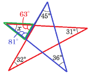 \( ∠x=180°-(63°+81°)=36° \)