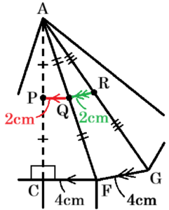 3点 \( P,Q,R \) は,それぞれ線分 \( AC,AF,AE \) の中点なので,中点連結定理より \( PQ//CF,QR//FG(FE) \) であり,