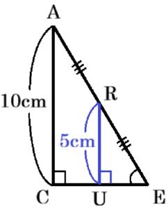 垂線をひいた交点を \( U \) とすると,\( △ACE \) ∽ \( △RUE \) になっているので,点 \( R \) は線分 \( AE \) の中点であることから,