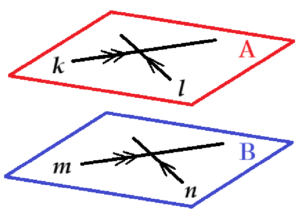 交わる2直線を \( k,l \),2直線 \( k,l \) を含む平面を面 \( A \),