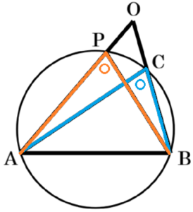 辺 \( AB \) は共通なので,\( ∠ACB \) と \( ∠APB \) を