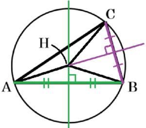 線分 \( AB \) の垂直二等分線と線分 \( BC \) の垂直二等分線の交点が \( H \) になります。