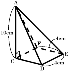 〔図2〕の展開図を組み立ててできた四角すいを3点 \( P,Q,R \) を通る平面と3点 \( R,S,T \) を通る平面で切ったとき,3つの立体ができる。この3つの立体のうち,点 \( C \) をふくむ立体の体積を求めなさい。