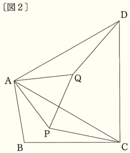 また,点 \( P \) は \( △ABC \) の内部にあり,\( △APQ \) が正三角形となるように点 \( Q \) をとる。ただし,点 \( Q \) は \( △ACD \) の内部にあるものとする。