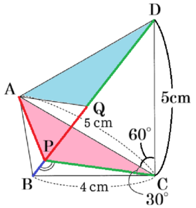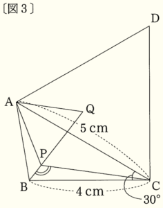 (2) 右の〔図3〕のように,\( AC=5 \; cm,BC=4 \; cm,∠ACB=30° \) とし,線分 \( AP \) と線分 \( BP \) と線分 \( CP \) の長さの和を\( AP+BP+CP \) と表す。