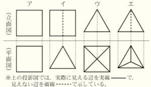 (7) 四角錐の投影図として最も適当なのは,ア~エのうちではどれですか。一つ答えなさい。