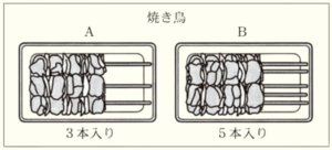 花子さんの家の近所にある焼き鳥屋では,図に示すように,焼き鳥 \( 3 \) 本入りの商品Aと \( 5 \) 本入りの商品Bの2種類の商品が販売されています。(1),(2)に答えなさい。