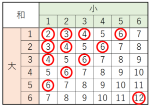 二つのさいころを同時に投げたときの出た目の組み合わせとその和を表に書き出すと右の図のようになります。