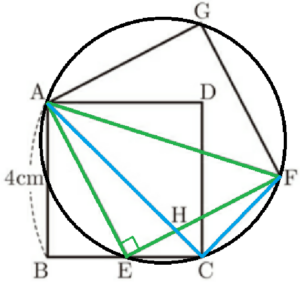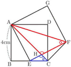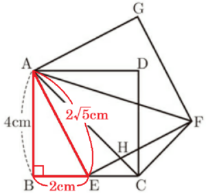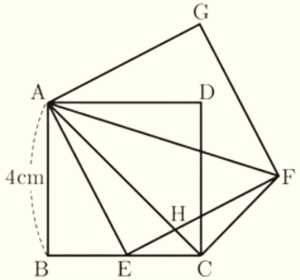 図のように,1辺の長さが \( 4 \; cm \) の正方形 \( ABCD \) があり,辺 \( BC \) の中点を \( E \) とし,線分 \( AE \) を1辺とする正方形 \( AEFG \) をかきます。点 \( A \) と点 \( C \),点 \( A \) と点 \( F \),点 \( C \) と点 \( F \) をそれぞれ結び,線分 \( EF \) と線分 \( AC \) の交点を \( H \) とします。(1)~(5)に答えなさい。