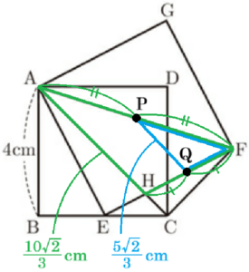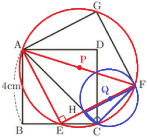 (5) 3点 \( A,E,F \) を通る円の中心を \( P \),3点 \( C,F,H \) を通る円の中心を \( Q \) とします。このとき,線分 \( PQ \) の長さを求めなさい。